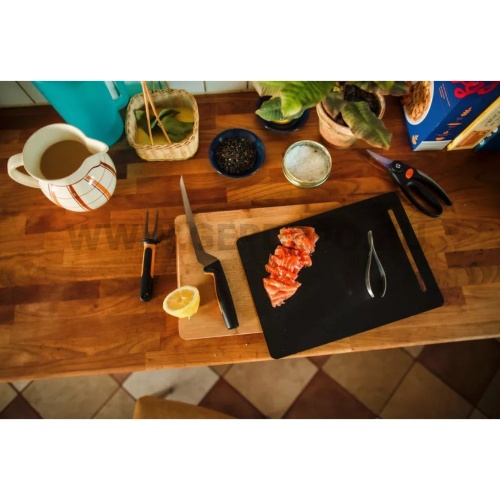 Azon szakácsok számára, akik értékelik az okosan megtervezett, könnyen kezelhető konyhai eszközöket, a Fiskars Functional Form ™ filéző kése elengedhetetlen. Tartós, japán rozsdamentes acél pengéje vékony és hajlékony, ideális húsok, halak filézéséhez. Ergonomikus markolata az ujjvégeknél SoftGrip™ borítással rendelkezik, a nagyobb ujjvédő résznek köszönhetően pedig kényelmesen és biztonságosan illeszkedik a kézbe. Mint minden Functional Form™ kés, ez a kés is mosogatógépben mosható az egyszerű, mindennapi tisztítás részeként, vékony kialakítása pedig segíti a könnyű tárolást. Finn termék.