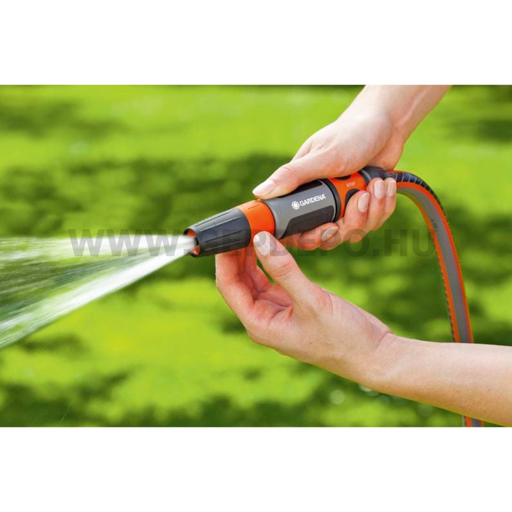 A GARDENA tisztító locsoló klasszikus locsolómodell. Akár tisztításhoz, akár öntözéshez kiválaszthatja a megfelelő locsolósugarat az erős sugártól a finom ködpermetig. A locsolóhüvely nem csavarható le, ezáltal nem is veszíthető el. A locsolósugár fokozat nélkül szabályozható. Ön választhatja ki az ideális formát. A lágy műanyag elemeknek köszönhetően jól illik a kézbe, nem csúszik.
