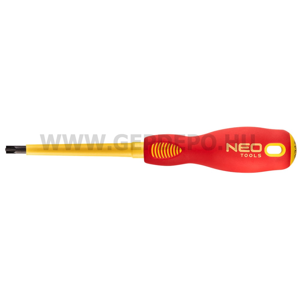 NEO Lapos és kereszt csavarhúzó 1000V. Alkalmassági tesztje 1000 V feszültségen került elvégzésre. A csavarhúzó csúcs tartós CrV acélból készült. A csúcsok munkafeje hő megmunkálva, melynek köszönhetően megfelelő a keménysége és hajlítószilárdsága. Speciális, S típusú biztosítékokhoz kifejlesztett csúcs. A profilozott hüvelykujj támasztós, háromszöges kialakítású markolat csökkenti a kéz megterhelését a munka közben és megkönnyíti az optimális nyomaték elérését. A kétanyagú markolat megakadályozza a kicsúszást és ellenáll a vegyszerek, olajok és zsírok hatásának. A szerszám minőségét a gyártó 25 éves garanciája igazolja.