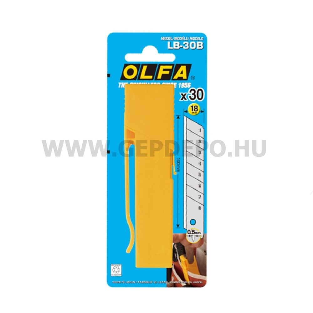OLFA LB-30B - 18mm-es standard tördelhető penge praktikus akasztófüles tokban. 30 penge / tasak. A következő standard késekhez alkalmazható: SL-1, BN-L, BN-AL, ML, L-1/green, L-2, XL-2, L-5, L5-AL, L-7, L7-AL, OL, NOL-1, NL-AL, PL-1, CL és CMP-2.