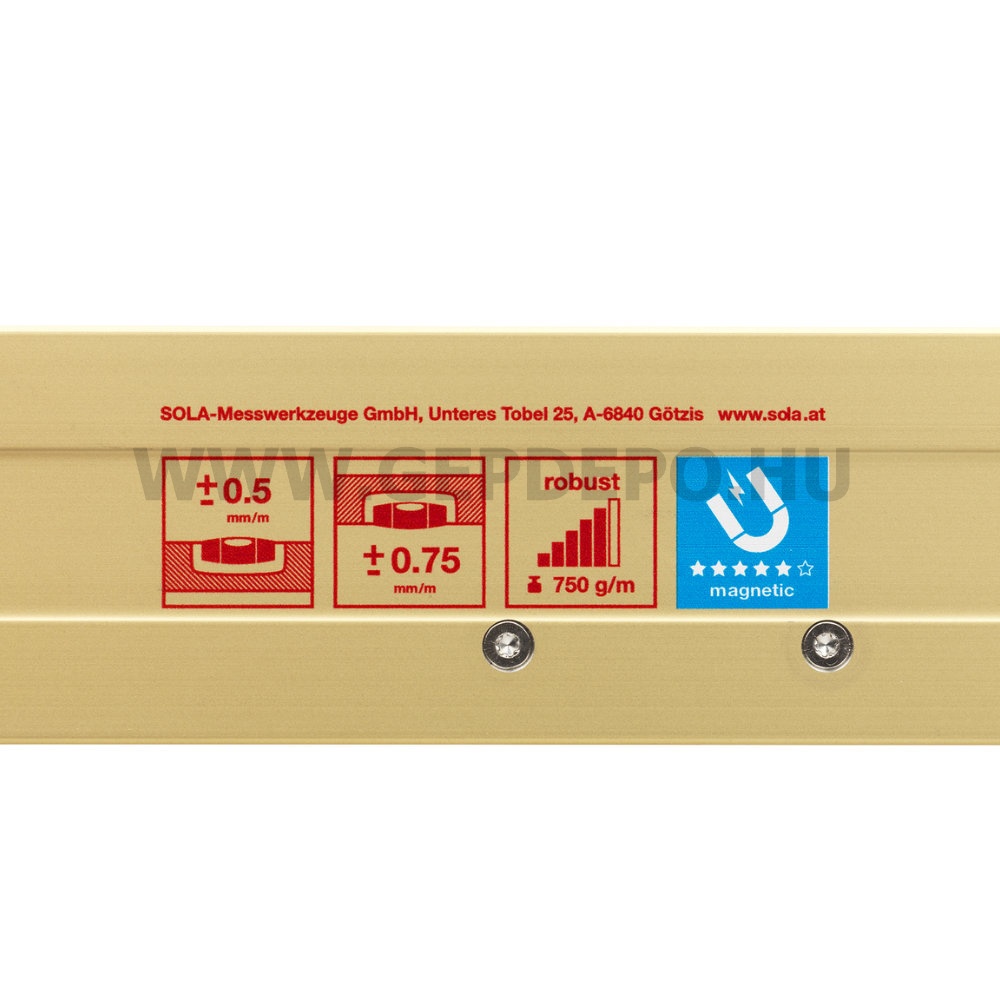 Jobb, gyorsabb és pontosabb leolvashatóság a szabadalmaztatott SOLA-FOCUS libellával Jobb leolvashatóságot biztosít a félhomályban a Sola-fluoreszkáló libella betét Nagyon magas mérési pontosság normál és fordított helyzetben is Oldalról beépített mágnesek a folytonos mérőfelület és a mágnesek maximális védelme érdekében Erős Neodym mágnes a magas tapadás érdekében Ütéscsillapító végdugók