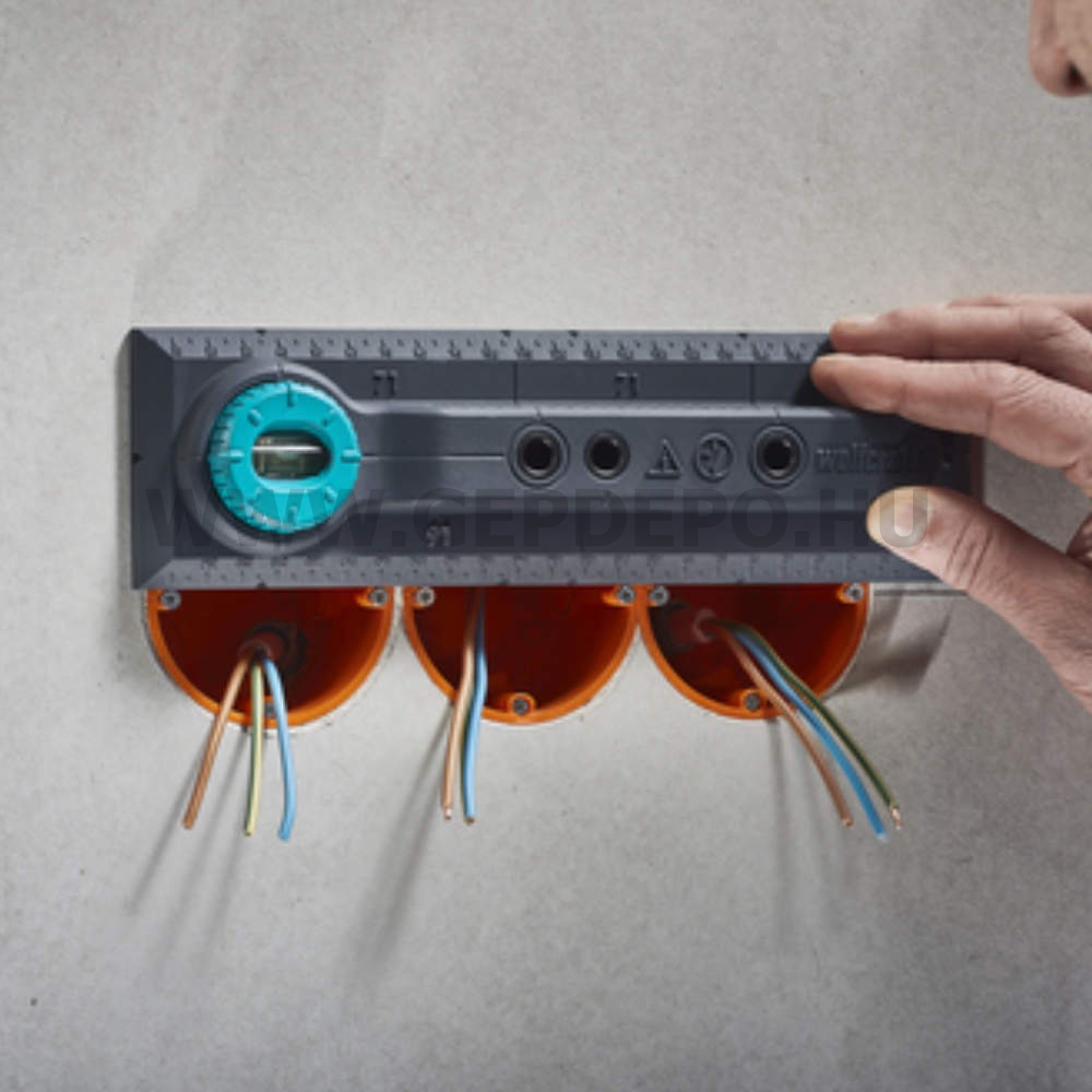 A beépített milliméteres skála segítségével gyorsan és pontosan meghatározhatja a megfelelő beépítési távolságot a nyers épületszerkezet szélétől. A fúrósablon minden oldalán 71 mm-es jelölésekkel rendelkezik, így könnyen átviheti a helyes szerelési távolságot két szerelődoboz között. A dugaszoló aljzatok és a TV- vagy hálózati aljzatok közötti szükséges 91 mm-es távolságnak megfelelő jelölések is rendelkezésre állnak.