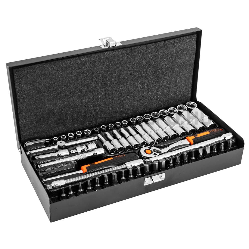 Egy teljes 1/4"-os szerszámkészlet tartós, praktikus, préselt logóval ellátott fémdobozba elhelyezve. A készletben 63 db kiváló minőségű króm-vanádium acélból készült elem található. A készletben megtalálható a hatlapú dugókulcsok gazdag sorozata is 4 mm-től egészen 14 mm-es méretig. A dugókulcsok két változata van jelen a készletben: rövid és hosszú. A készletben megtalálhatók az E-típusú dugókulcsok is, az egyre népszerűbb Torx csavarokhoz. A dugókulcsok kényelmesek, tartósak és időt takarítanak meg a gyorsan cserélhető biteknek köszönhetően. A készlet tartozékok széles körét tartalmazza, többek között négy hosszabbítót, T-hajtókart, csuklót, 1/4"-os csavarhúzó markolatot. A dobozban megtalálható csavarbehajtó adapter lehetővé teszi a készlet alkalmazását az elektromos szerszám tartozékaként. Az 1/4"-os , hajlított racsnis hajtókar kilincsműve 90-fogas, megkönnyítve ezzel a munkát a szűk helyeken (a kilincs már 5°-os elfordulásnál új fogárokba húz). Minden elem csoportosítva formázott műanyag tálcában kapott helyet, így könnyen kiválaszthatók a szükséges darabok. A nemzetközi TÜV tanúsítvány és a 25 éves jótállás a szerszám megbízhatóságát és kiváló minőségét bizonyítja. A NEO márka a professzionális igényeket is kielégíti.