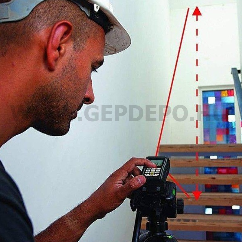 Főbb jellemzők:• 100 m-es hatótávolság dőlésérzékelővel• Megvilágított 2 soros LCD kijelző• Összeadás, kivonás funkció• 20 tárolható mérés• Visszahajtható fogantyú rész a sarkok és élek pontos méréséhez• Állványra rögzíthető• Pontosság: +-1 mm• Munkatartomány: 0,05 - 100 m• Működés: 2 db AAA elem• 635 nm class II lézer• Zárt, szigetelt ház IP54-es védettségi osztály, por és cseppállóElvégezhető számítások:• Távolság számítás• Terület számítás• Térfogat számítás• Pitagorasz számítás (3x)