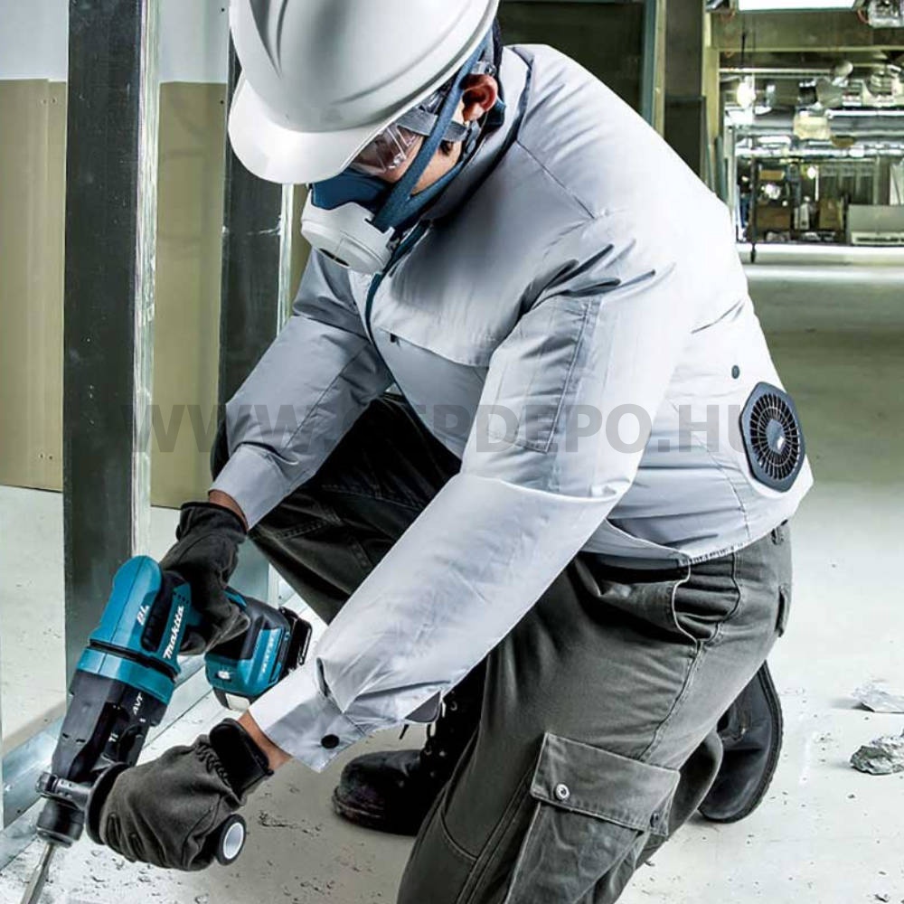 Maradjon hűvös a forró, zord munkakörülmények között. • Akár 33 óra hűvös levegő 18 V-os, 6,0 Ah-s LXT akkumulátorral. • 5 zseb: cipzáras mellkasi zsebek (bal/jobb) / nehezen szakadható oldalsó zsebek (bal/jobb) / bal karzseb • Az elektromos áramforrás eltávolítható a kabátból, hogy géppel mosható legyen • 100% poliészter – Jó páratartalom-áteresztő képesség és jó víztaszító képesség • A nagy teljesítményű ventilátor légáramot biztosít, amely hatékonyan elpárologtatja a testről az izzadságot, így hűvös érzetet nyújt • 4 légáramlás-beállítás (turbo/magas/közepes/alacsony) a pontos hűtésszabályozáshoz • A stabil állógallér és a keskenyített derék további védelmet és kényelmet biztosít zord körülmények között • Könnyen eltávolítható ventilátor – mégis stabilan rögzítve pattintós gombokkal ellátott pántokkal • Be-/kikapcsoló légáramlás-szabályozó 3 LED-jelzővel • Az akkumulátorvédelmi rendszer túlterhelés elleni védelmet biztosít az akkumulátor ciklusának és teljes élettartamának meghosszabbítása érdekében
