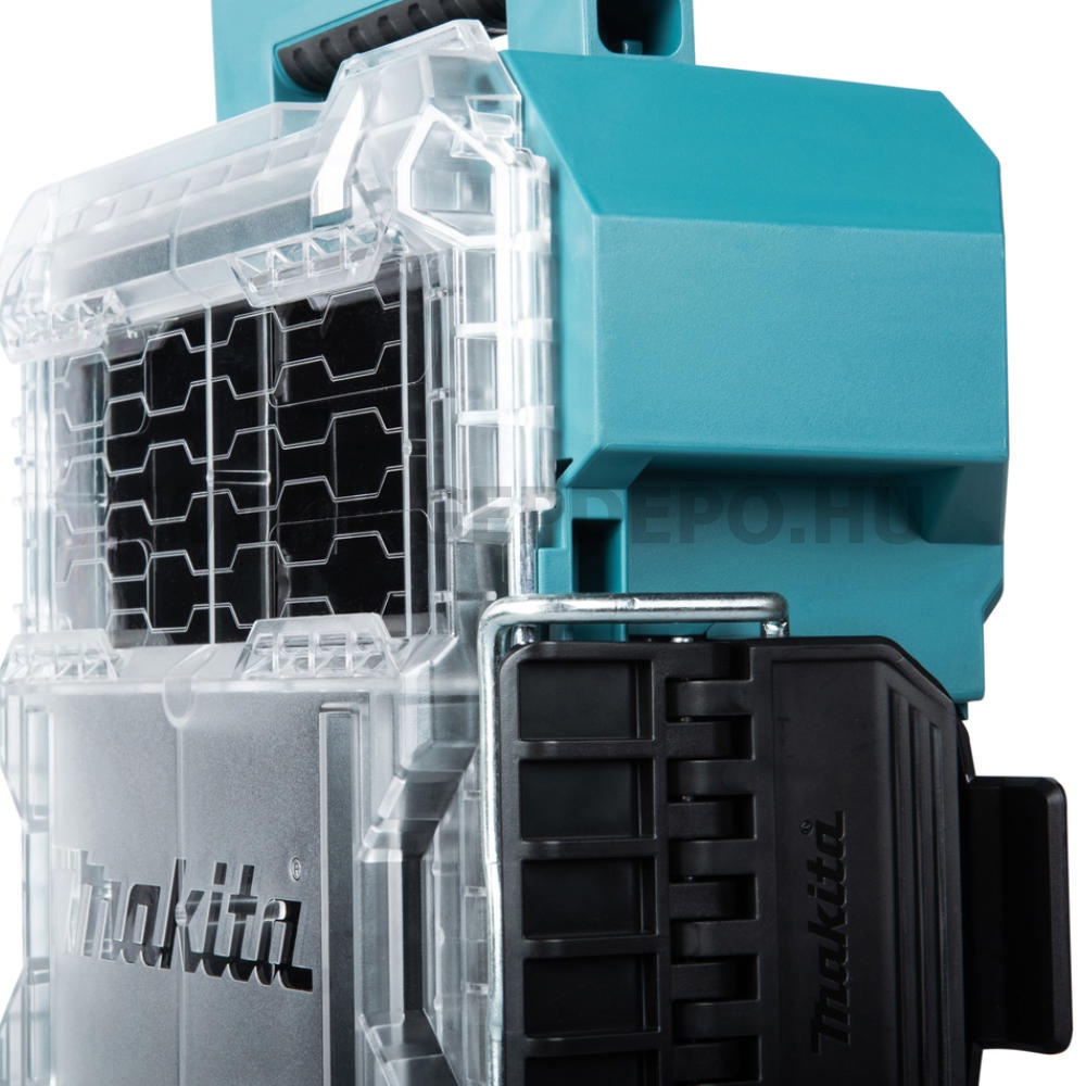 Makita MAKTRAK™ kompakt rendszerező egy moduláris tárolási megoldás a munkaterületen használt felszerelések szállításához, hozzáféréséhez, tárolásához és rendszerezéséhez, vízszintes kialakításával maximális hozzáférhetőséget biztosít és hosszú szerszámok tárolására is alkalmas.