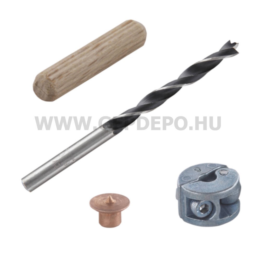 Készlet dübeles kötések készítéséhez Fakötések létrehozásához való készlet, melynek tartalma: furatjelölők, fafúrószárak, mélységbeállítók és facsapok 4 furatjelölő tükrözött csaplyukak pontos jelöléséhez Fafúrószár precíziós marású elővágó éllel és központozó csúccsal, megbízható furatmélység-beállítás mélységbeállítóval