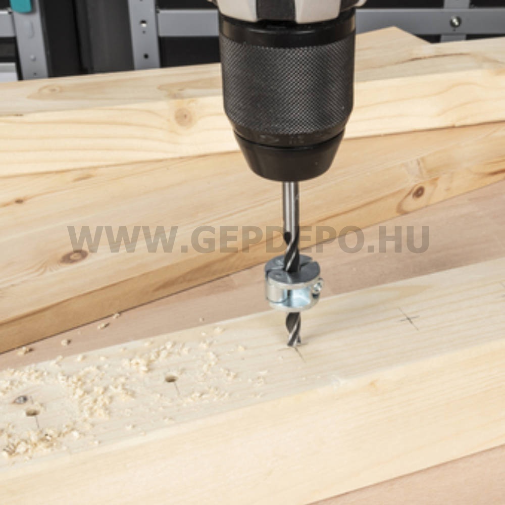 Fakötések mélységben korlátozott fúrásához Csapfúró mélységütközővel fa, rétegelt lemez, forgács- és kemény farostlemez mélységben korlátozott fúrásához Pontosan csiszolt elővágóél és központozó csúcs A mélységütköző egyszerűen és csúszásmentesen felszerelhető a fúróra