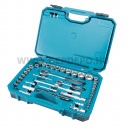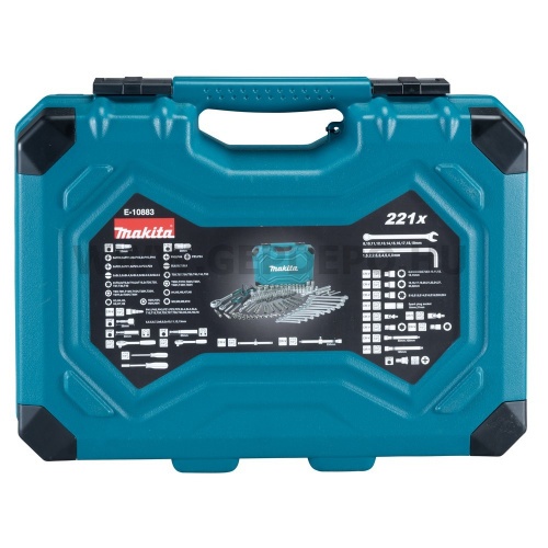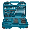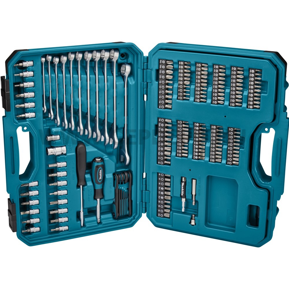Makita 221 darabos szerszámkészlet kofferbenPraktikus szerelő szett a legtöbb kivitelzési munkákhoz! Belül elválasztó rekesszel és tárolókkal szerelt koffermelyben kényelmesen elférnek a bitek szerelő szerszámok, dugókulcsok.Ideális a barkácsolni vágyóknak, szerelőknek, hasznos kiegészítője a Makita gépeknek!Kéziszerszámkészlet 221 darabos, műanyag kofferben, amely a következőkből áll:90 darabos csavarhúzóbitkészlet 25mm 1/4" forma C: 10x Hornyolt bitek: [S3 x2 / S4 x2/ S5 x2 / S5.5 x2/ S6.5 x2]36x Phillips-bitek: [PH0 x5 / PH1 x5 / PH2 x20 / PH3 x5 / PH4 x1]10x Pozidriv bitek: [PZ0 x2 / PZ1 x2 / PZ2 x3 / PZ3 x1 / PZ4 x1]16x Torx bitek: [T8 x2 / T x2 / T10 x2 / T15 x2 / T20 x2/ T25 / T27 / T30 / T40]11x Torx bit biztonsági / szabotázs elleni fej; [T8H / T9H / T10H / T15H / T20H / T25H / T27H / T30H x2 / T35H ]6x hatszögletű/hatlapfejű bit: [H3 / H4 / H5 / H6 / H7 / H8]4x hatszögletű/hatlapfejű bit biztonsági/szabotázs-gátló fej [H3H / H4H / H5H / H6H,30 darabos csavarhúzó bitkészlet, 30 mm-es 5/16" alakú C:3x Slot bit: [SL6 / SL7 / SL8 ]2x Phillips bit: [PH3 / PH4 ]2x Pozidriv bit: [PZ3 / PZ4]7x Torx bit: [T25 / T27 / T30 / T35 / T40 / T45 / T50]10x Torx bit biztonsági/szabotázs-gátló fej ; [T25H / T27H / T30H / T35H / T40H / T45H / T50H]5x Hatszögletű/Hex bitek: [H4 / H5 / H6 / H7 / H8]4x Többfogú bit [M5 / M6 / M8 / M10]31 darabos foglalat készlet különböző méretekben mm-ben:13x 1/4"-os aljzatok [4 / 4,5 / 5 / 5,5 / 6 / 7 / 8 / 9 / 10 / 11 / 12 / 13 /14]11x 1/2"-os aljzatok [15 / 16 / 17 / 19 / 20 / 21 / 22 / 24 / 27 / 30 / 32]7x 1/2" E-torx aljzatok [E10 / E12 / E 14/ E16 / E18 / E20 / E24]1x 1/4" racsnis1 x 1/2" racsnis1x 1/4" bit csavarhúzó1 x dugós csavarhúzó 1/4" négyzet11x kombinált kulcs [8 / 10 / 11 / 12 / 13 / 14 / 15 / 16 / 17 / 18 / 19mm] 1x imbuszkulcs készlet [ 1,5 / 2 / 2,5 / 3 / 4 / 5 / 6 / 8 mm] 10 x dugó 1/ 4"-es formájú e-aljzattal [ 5 / 5,5 / 6 / 7 / 8 / 9 / 10 /11 / 12 /13]2x gyújtógyertya sapka16/21 mm] 1x dugaszoló adapter 1/2" anya 3/ 8"-os apa2x univerzális csukló [ 1/4" és 1/2"]2x 1/2" hosszabbítás 125 és 250 mm-es méretben2x 1/4" hosszabbítás 50 és 100 mm1x t-csavarrúd1x mágneses bittartó1x kihúzható csavaros jogosultja [80 mm]1x 1/4" női socket 1/4" kicsit aljzat1x 1/2" belső socket 5/16" kicsit aljzat1 x gipszkarton csavar útmutató