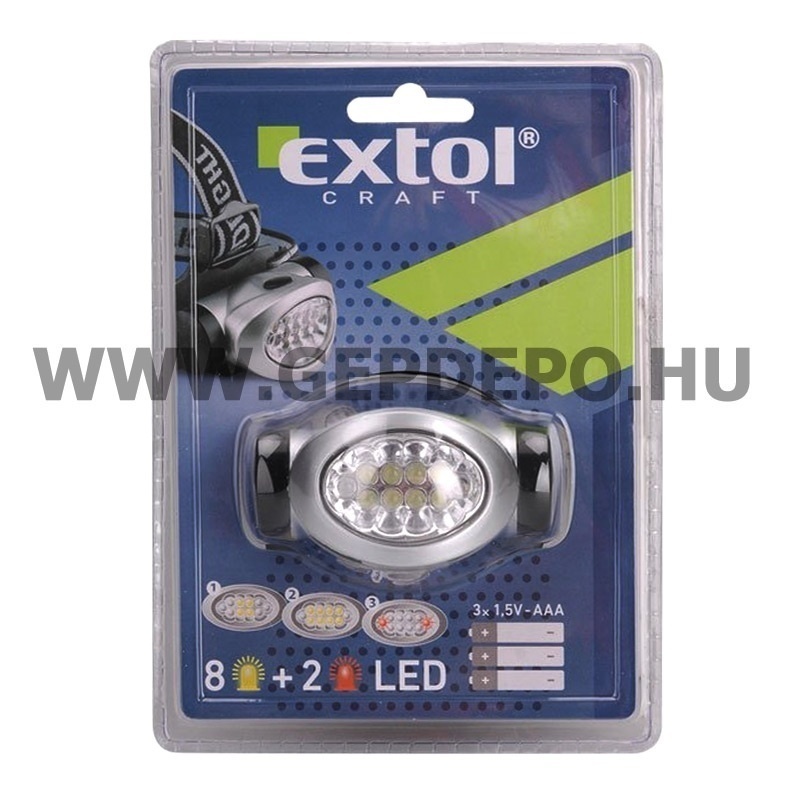 • Fejlámpa 8+2 leddel (8 db fehér + 2 db piros)• Csepálló• 4 állású fényerő kapcsoló (kikapcsolt - 2 piros led villog - 4 fehér led világít - 8 fehér led világít)• 3 db 1,5V AAA elemmel működik• ABS műanyag ház, 45° állítható fejszög• Fényerő: 15 000 mcd• Led-ek várható élettartama: kb. 50 000 óra • Állítható gumis fejpánt• Max. hatótáv kb. 15 m• Elméleti, várható világítási idő (teljesen feltötltött, friss elemek esetében):- 2 leddel: kb. 60 óra- 4 leddel: kb. 41 óra- 8 leddel: kb. 37 óra